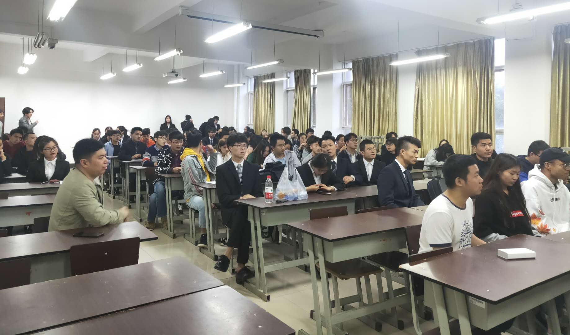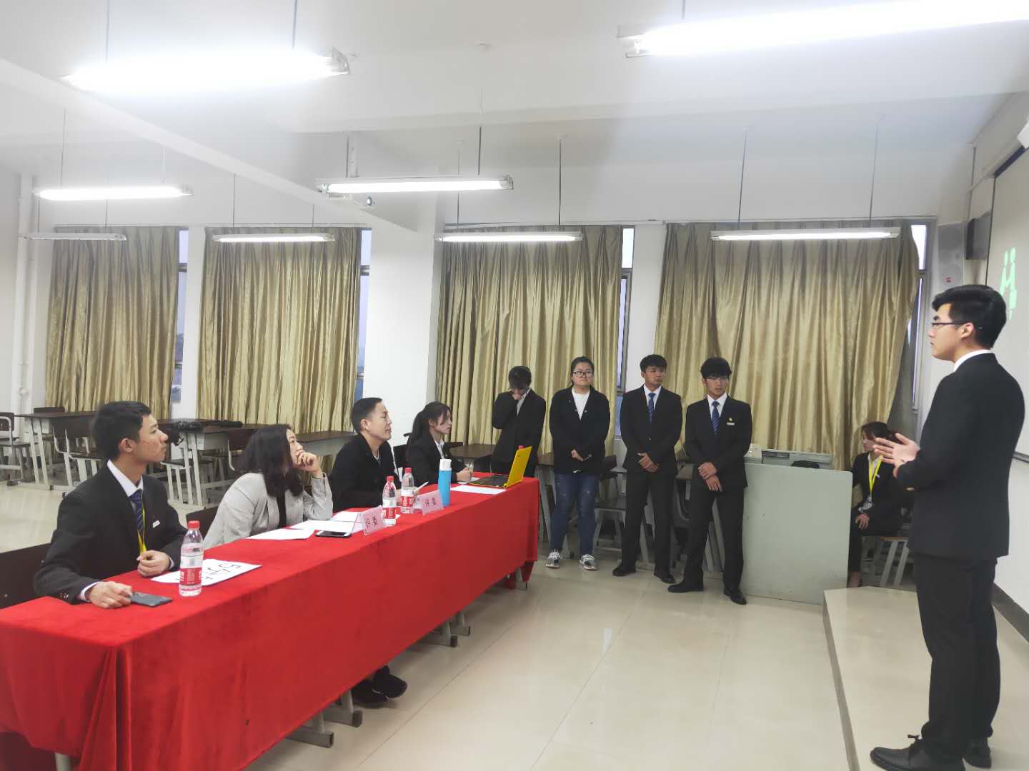 经过前期院学生会和院团委的准备工作,晚上7:00我们的评委老师和参赛人员便正式进入了答辩状态。候考室302-1内的参赛人员们各抒己见,讨论着自己团队的参赛项目;答辩场上各团队成员激情澎湃地介绍着他们的参赛策划案,从他们口中我们了解到他们前期撰写创新、创业策划方案;现场陈述参赛队派代表用PPT的方式对方案进行展示和陈述,各参赛队的演示项目有投资理财、AI智能、社交软件和活动等多方面;评委提问环节每队回答评委的现场提问,让参赛人员对自身项目的竞争力和吸引力有了新的见解。