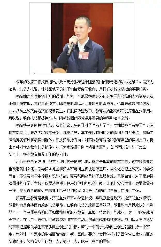 3月13日,由中共中央党校主办的《学习时报》在(两会聚焦:打赢三大攻坚战之精准脱贫)专题中,刊发了全国人大代表、云南工商学院执行校长李孝轩署名文章:《用好教育这个阻断贫困代际传递的治本之策》。教育扶贫,云南工商学院一直在践行。