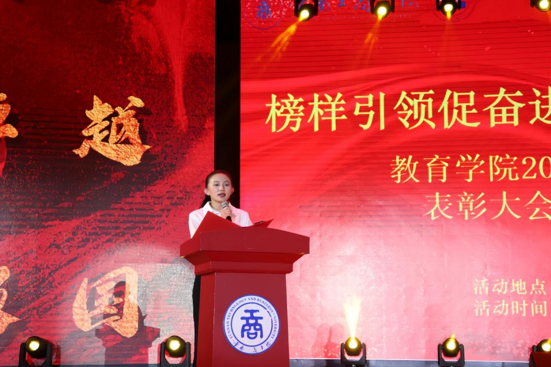 教育学院院长黄淇在讲话中首先向所有受到表彰的师生、集体表示热烈祝贺,向为学校学风建设工作付出辛勤努力、作出卓越贡献的全体师生表示衷心感谢。黄院长指出,教育不仅是知识的传递,它更是一道照亮心灵的明光,是一场师生间共同成长与修行的旅程。它如同播种者,在每个学生心中种下梦想的种子,也如同执火者,扬起希望的火把,引领我们前行。本次表彰大会,既是对过去一学年辛勤付出的总结,也是新学年扬帆起航的起点。她殷切地期望每一位学生都能立志成为“四有”好老师,并努力成为新时代的“大先生”,肩负起教书育人的崇高使命。