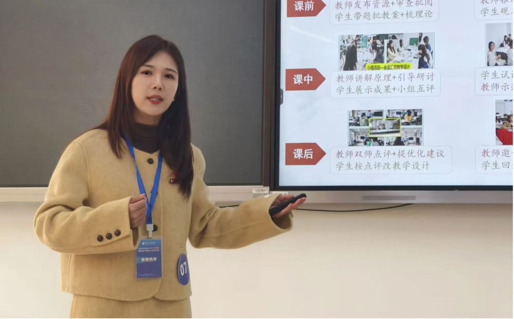 大三阶段,开设《小学语文课堂教学技能训练》等实践课程,创新融入AI赋能教学融合模式,以任务驱动和情境模拟对接一线教学需求。古诗教学用“品、赏、悟、演、融、创”多步教学法深挖文化内涵;课堂技能训练通过角色互换贴合学情设计教学;同时依托AI实现“课前名师资源推送+课中示范纠错+课后双师点评+视频反思”的教学闭环,全方位淬炼学生核心教学能力。