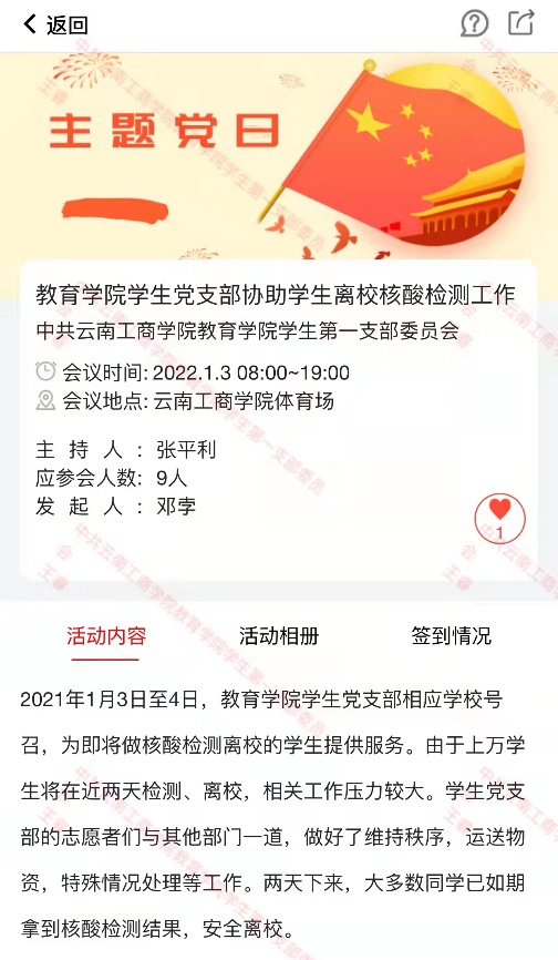 主题党日——教育学院学生党支部协助学生离校核酸检测工作中共云南工商学院教育学院学生第一支部委员会会议时间:2022.1.3 08:00~19:00会议地点:云南工商学院体育场主持人:张平利应参会人数:9人发起人:邓孛会活动内容 2021年1月3日至4日,教育学院学生党支部相应学校号召,为即将做核酸检测离校的学生提供服务。由于上万学生将...