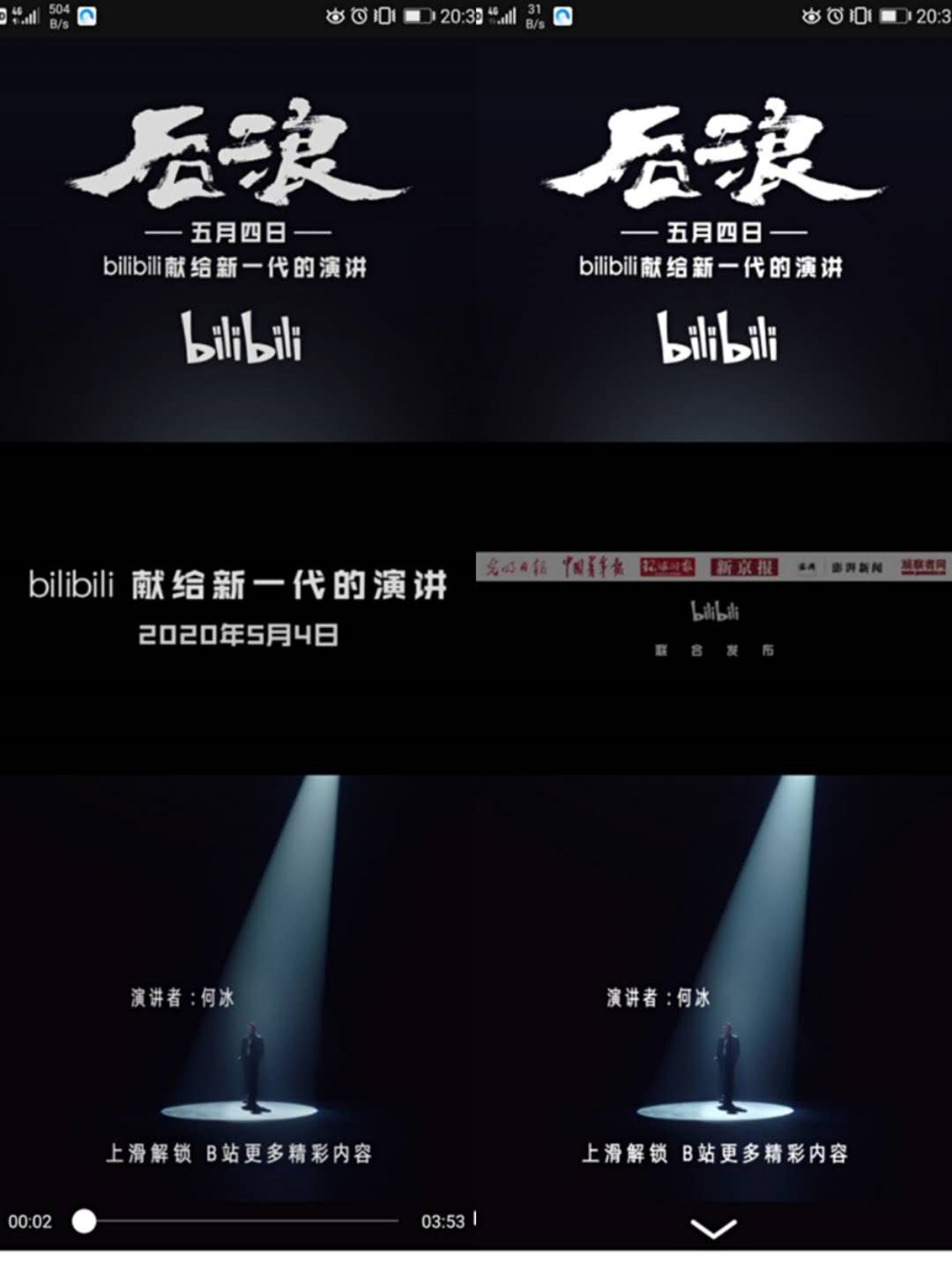 2020年5月4日青年节,弹幕网站哔哩哔哩发布的献给新一代的演讲《后浪》里,国家一级演员何冰以青年宣
